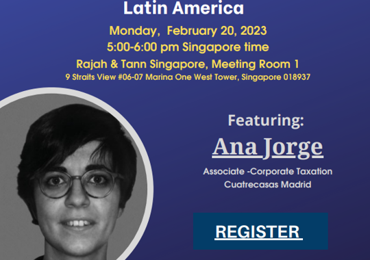 The IFA Singapore Branch is pleased to invite you to join us on the IFA ITD entitled “Spain as the gateway for investments in Latin America.” featuring Ana Jorge of Cuatrecasas on February 20, 2023 at 5-6PM Singapore time to be held at Rajah & Tann Office, Meeting Rm 1.