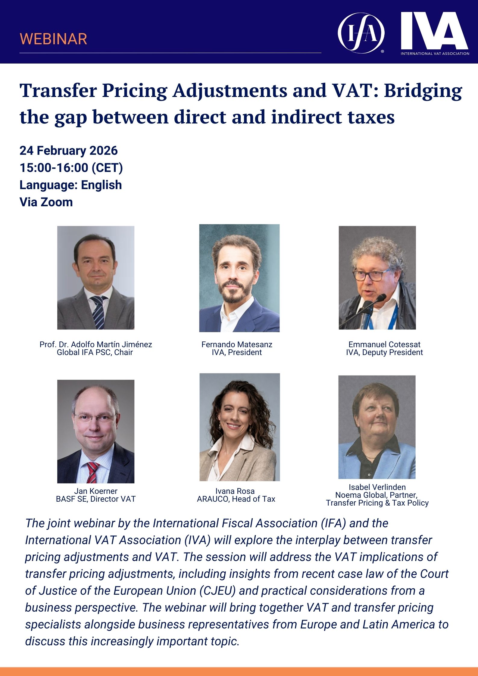 The joint webinar by the International Fiscal Association (IFA) and the International VAT Association (IVA) will explore the interplay between transfer pricing adjustments and VAT. The session will address the VAT implications of transfer pricing adjustments, including insights from recent case law of the Court of Justice of the European Union (CJEU) and practical considerations from a business perspective. The webinar will bring together VAT and transfer pricing specialists alongside business representatives from Europe and Latin America to discuss this increasingly important topic.